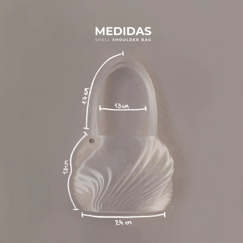 uma bolsa que guarda, revela, brilha e questiona. sua transparência não esconde — revela camadas, reflexos e intenções. seu brilho perolado transmite a beleza natural e imperfeita daquilo que se transforma.